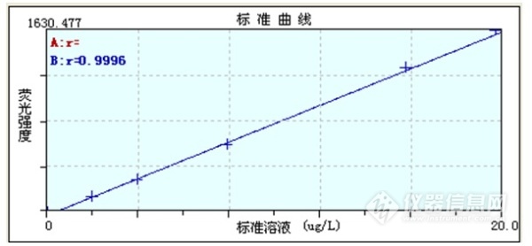 標準曲線繪制,取1000μg/mL銻標液稀釋成1000ng/mL的標準工作液,分別吸取0mL,0.2mL,0.4mL,0.8mL,1.6mL和2.0mL銻標準工作液,置于100mL容量瓶中,加入5mL鹽酸加入10mL硫脲溶液(100g/L),室溫放置30min,混勻,用去離子水定容,配置成0ng/mL,2ng/mL,4ng/mL,8ng/mL,16ng/mL和20ng/mL的標準系列溶液。繪制熒光強度-濃度標準曲線。