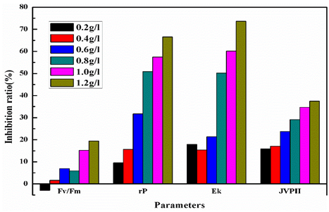 該項(xiàng)研究以葉綠素?zé)晒鉃樵孱惞夂献饔眠^(guò)程探針,開展了苯酚急性毒性作用下的72小時(shí)與70分鐘內(nèi)蛋白核小球藻的光合抑制試驗(yàn),研究了不同毒性強(qiáng)度下藻類各光合活性參數(shù)的響應(yīng)規(guī)律。結(jié)果表明苯酚急性毒性對(duì)光合活性參數(shù)Fv/Fm、rP、α、Ek、JVPⅡ的抑制效應(yīng)顯著,5分鐘內(nèi)毒性效應(yīng)就能達(dá)到穩(wěn)定。研究結(jié)果為水質(zhì)生物毒性檢測(cè)、生態(tài)毒理學(xué)研究及毒性物質(zhì)快速檢測(cè)等提供了一種新方法。