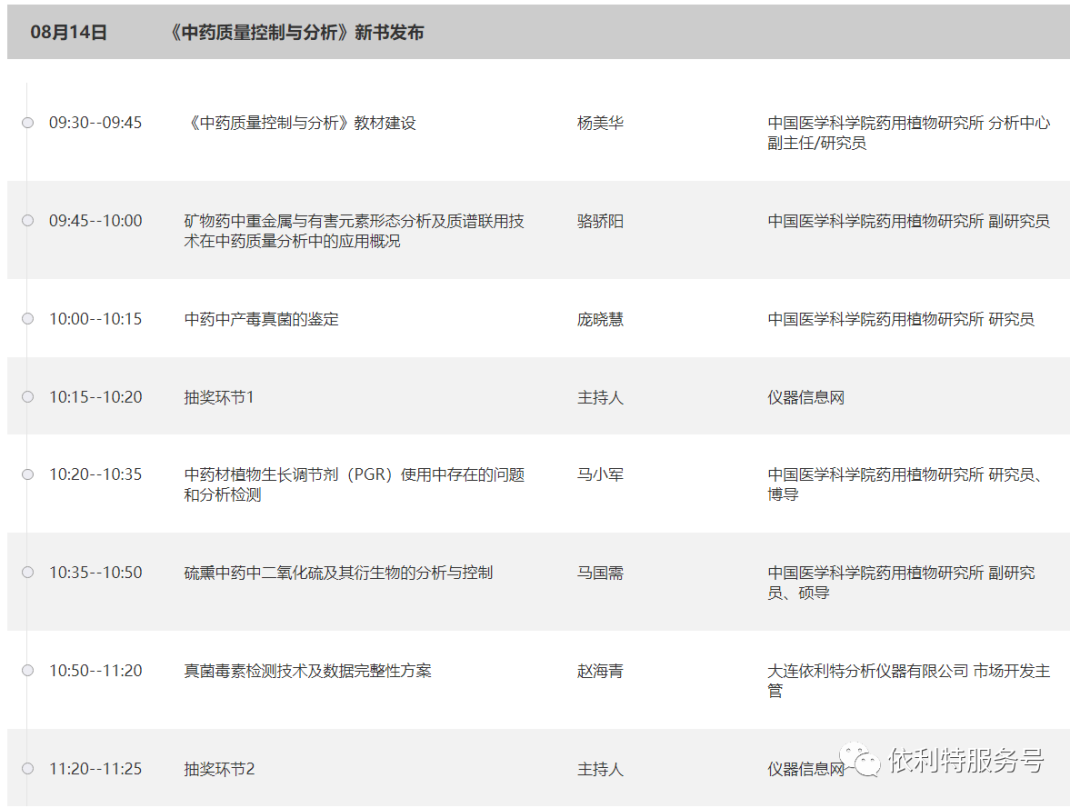 2、關(guān)注【依利特服務(wù)號(hào)】,獲得會(huì)后回放視頻、并有機(jī)會(huì)獲得《中藥質(zhì)量控制與分析》新書(shū)。