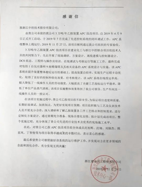 3萬(wàn)噸/年乙胺裝置是建業(yè)化工最具代表性的裝置之一,為解決產(chǎn)品質(zhì)量波動(dòng)、操作人員勞動(dòng)強(qiáng)度大等問(wèn)題,建業(yè)化工決定在乙胺裝置上率先引入APC技術(shù)以提升自動(dòng)化水平,改善產(chǎn)品質(zhì)量,達(dá)到安全可控、節(jié)能降耗的生產(chǎn)目標(biāo);同時(shí)也希望通過(guò)乙胺裝置APC系統(tǒng)的成功應(yīng)用,為其它裝置提供標(biāo)桿與借鑒。2019年3月,中控技術(shù)與建業(yè)化工正式簽訂APC開(kāi)發(fā)協(xié)議。