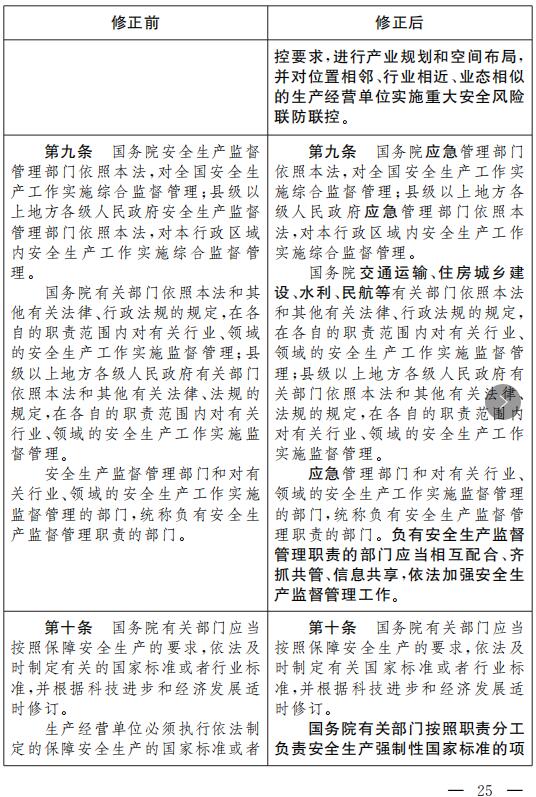 (一)將第九條第一款、第二十條、第二十四條、第二十七條、第三十五條、第四十條、第五十九條、第六十二條、第七十三條、第八十六條、第一百零六條中的 “安全生產(chǎn)監(jiān)督管理部門”修改為 “應(yīng)急管理部門”,第九條第二款中的 “國務(wù)院有關(guān)部門”修改為 “國務(wù)院交通運(yùn)輸、住房城鄉(xiāng)建設(shè)、水利、民航等有關(guān)部門”,第三十一條中的 “安全生產(chǎn)監(jiān)督管理部門” 修改為