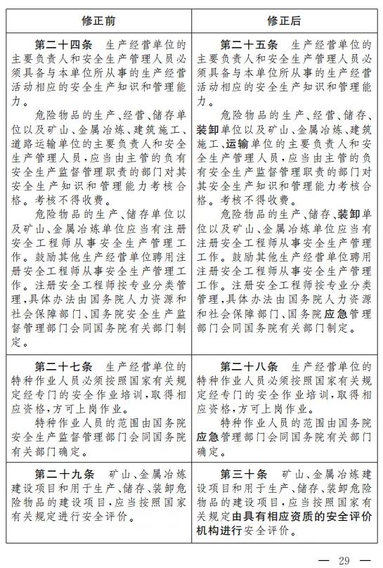 九、將第二十九條改為第三十條,修改為:“礦山、金屬冶煉建設(shè)項(xiàng)目和用于生產(chǎn)、儲存、裝卸危險(xiǎn)物品的建設(shè)項(xiàng)目,應(yīng)當(dāng)按照國家有關(guān)規(guī)定由具有相應(yīng)資質(zhì)的安全評價(jià)機(jī)構(gòu)進(jìn)行安全評價(jià)。”