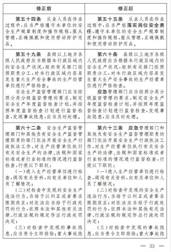 十五、將第五十四條改為第五十五條,修改為:“從業(yè)人員在作業(yè)過程中,應(yīng)當(dāng)嚴(yán)格落實(shí)崗位安全責(zé)任,遵守本單位的安全生產(chǎn)規(guī)章制度和操作規(guī)程,服從管理,正確佩戴和使用勞動防護(hù)用品。”