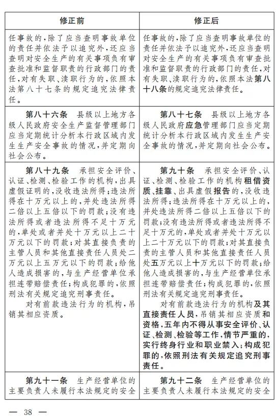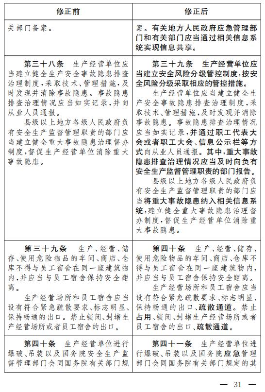 十一、將第三十八條改為第三十九條,修改為:“生產(chǎn)經(jīng)營單位應(yīng)當(dāng)建立安全風(fēng)險(xiǎn)分級管控制度,按安全風(fēng)險(xiǎn)分級采取相應(yīng)的管控措施。
