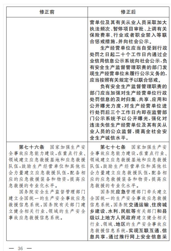 十九、將第七十六條改為第七十七條,第二款修改為:“國務(wù)院應(yīng)急管理部門牽頭建立全國統(tǒng)一的生產(chǎn)安全事故應(yīng)急救援信息系統(tǒng),國務(wù)院交通運(yùn)輸、住房城鄉(xiāng)建設(shè)、水利、民航等有關(guān)部門和縣級以上地方人民政府建立健全相關(guān)行業(yè)、領(lǐng)域、地區(qū)的生產(chǎn)安全事故應(yīng)急救援信息系統(tǒng),實(shí)現(xiàn)互聯(lián)互通、信息共享,通過推行網(wǎng)上安全信息采集、安全監(jiān)管和監(jiān)測預(yù)警,提升監(jiān)管的精準(zhǔn)化、智能化水平。”