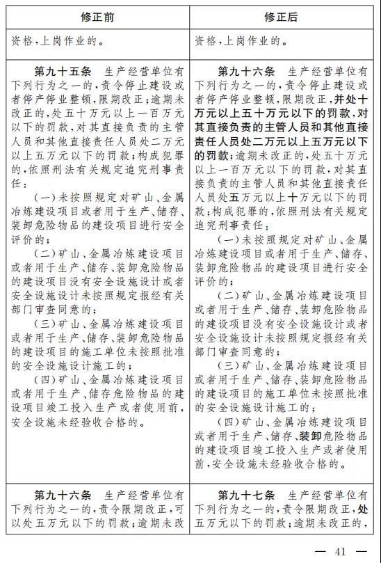二十七、將第九十五條改為第九十六條,修改為:“生產(chǎn)經(jīng)營單位有下列行為之一的,責(zé)令停止建設(shè)或者停產(chǎn)停業(yè)整頓,限期改正,并處十萬元以上五十萬元以下的罰款,對其直接負(fù)責(zé)的主管人員和其他直接責(zé)任人員處二萬元以上五萬元以下的罰款;逾期未改正的,處五十萬元以上一百萬元以下的罰款,對其直接負(fù)責(zé)的主管人員和其他直接責(zé)任人員處五萬元以上十萬元以下的 罰款;構(gòu)成犯罪的,依照刑法有關(guān)規(guī)定追究刑事責(zé)任: