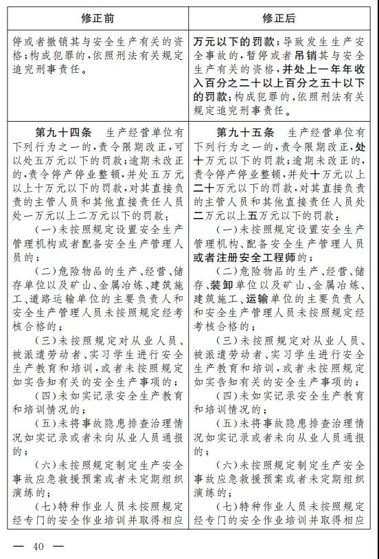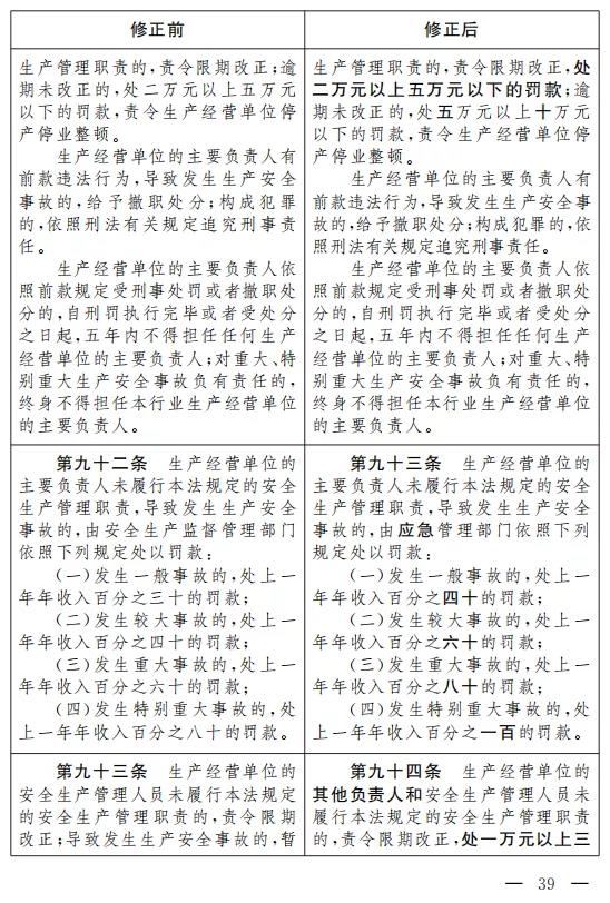 二十五、將第九十三條改為第九十四條,修改為:“生產(chǎn)經(jīng)營單位的其他負(fù)責(zé)人和安全生產(chǎn)管理人員未履行本法規(guī)定的安全生產(chǎn)管理職責(zé)的,責(zé)令限期改正,處一萬元以上三萬元以下的罰款;導(dǎo)致發(fā)生生產(chǎn)安全事故的,暫停或者吊銷其與安全生產(chǎn)有關(guān)的資格,并處上一年年收入百分之二十以上百分之五十以下的罰款;構(gòu)成犯罪的,依照刑法有關(guān)規(guī)定追究刑事責(zé)任。”