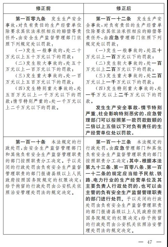 三十四、將第一百零九條改為第一百一十二條,修改為:“發(fā)生生產(chǎn)安全事故,對負(fù)有責(zé)任的生產(chǎn)經(jīng)營單位除要求其依法承擔(dān)相應(yīng)的賠償?shù)蓉?zé)任外,由應(yīng)急管理部門依照下列規(guī)定處以罰款:
