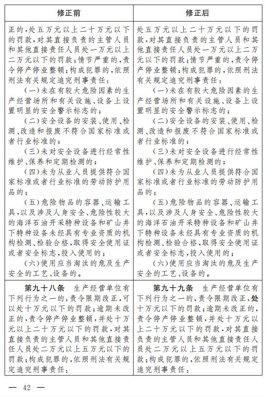 二十八、將第九十八條改為第九十九條,修改為:“生產(chǎn)經(jīng)營單位有下列行為之一的, 責(zé)令限期改正, 處十萬元以下的罰款;逾期未改正的,責(zé)令停產(chǎn)停業(yè)整頓,并處十萬元以上二十萬元以下的罰款,對其直接負(fù)責(zé)的主管人員和其他直接責(zé)任人員處二萬元以上五萬元以下的罰款;構(gòu)成犯罪的,依照刑法有關(guān)規(guī)定追究刑事責(zé)任: