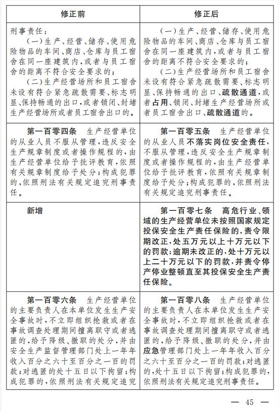 三十一、增加一條,作為第一百零七條:“高危行業(yè)、領(lǐng)域的生產(chǎn)經(jīng)營單位未按照國家規(guī)定投保安全生產(chǎn)責(zé)任保險(xiǎn)的,責(zé)令限期改正,處五萬元以上十萬元以下的罰款;逾期未改正的,處十萬元以上二十萬元以下的罰款,并責(zé)令停產(chǎn)停業(yè)整頓直至其投保安全生產(chǎn)責(zé)任保險(xiǎn)。”