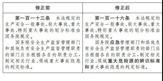 三十六、將第一百一十三條改為第一百一十六條,第二款修改為:“國務(wù)院應(yīng)急管理部門和其他負(fù)有安全生產(chǎn)監(jiān)督管理職責(zé)的部門應(yīng)當(dāng)根據(jù)各自的職責(zé)分工,制定相關(guān)行業(yè)、領(lǐng)域重大危險(xiǎn)源的辨識標(biāo)準(zhǔn)和重大事故隱患的判定標(biāo)準(zhǔn)。”