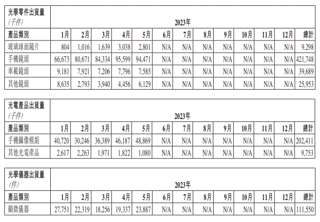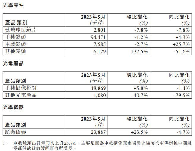 近日,舜宇光學(xué)科技公布2023年5月各主要產(chǎn)品出貨量。