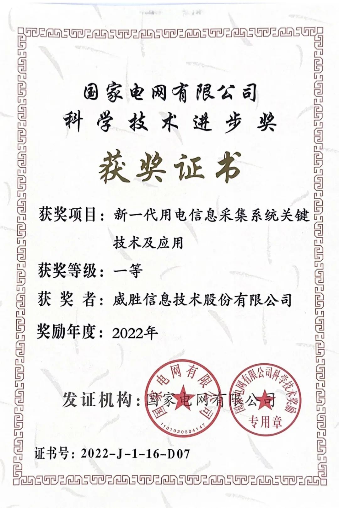 近日,威勝信息參與的“新一代用電信息采集系統(tǒng)關(guān)鍵技術(shù)及應(yīng)用”項(xiàng)目獲得國(guó)家電網(wǎng)有限公司2022年度科學(xué)技術(shù)進(jìn)步一等獎(jiǎng)。