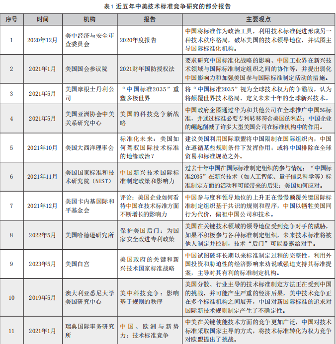 美中經濟與安全審查委員會是在中國加入WTO的背景下,美國國會為了監測中美貿易交往對美國經濟與安全影響于2001年特設的機構。在中國標準化活動研究方面,該委員會早在2013年就發布了《中國在技術標準上的崛起:舊制度中的新規范》,報告稱,中國確實利用技術標準作為保護主義的工具,但并未對美國構成挑戰。此后近十年,由于中國在標準化方面的努力和國際影響力的提升引起了美國的關注和警惕,從官方部門到民間智庫,開展了大量關于中國標準化活動的研究,政府也采取了相應的政策措施(見表1)。同時,其他國家也關注著中美在技術標準領域的競爭,如澳大利亞、瑞典等。