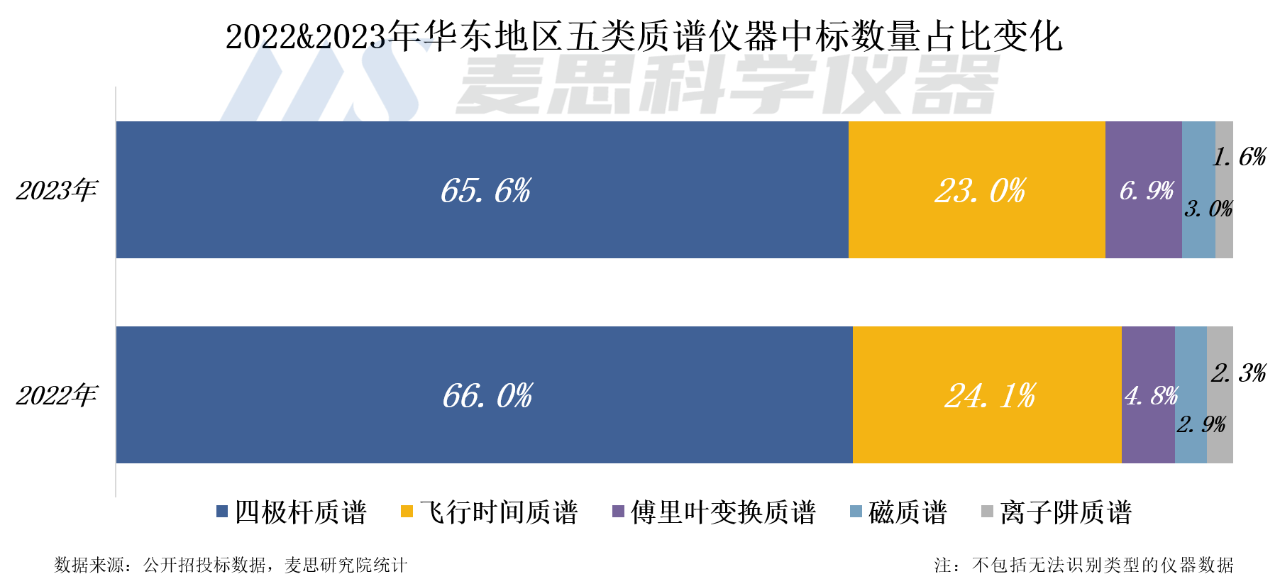 從各技術路線看,2023年華東地區(qū)四極桿質譜中標數(shù)量最多,占比65.6%,與2022年持平。飛行時間質譜排名第二,中標數(shù)量占比為23.0%,同比減少1.1個百分點。傅里葉變換質譜的占比為6.9%,排名第三,同比增加2.1個百分點。