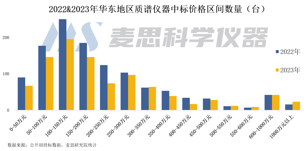 從各價格區(qū)間的中標數(shù)量來看,華東地區(qū)質譜儀器中標單價主要集中在350萬元以內,占比超80%。其中,中標單價在100-150萬元以內的質譜儀器數(shù)量最多,2023年中標數(shù)量占比為20%;其次為50-100萬元以及150-200萬元的質譜儀,占比均為15%。