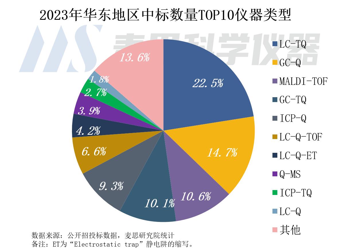 2023年華東地區(qū)中標數(shù)量Top10儀器類型分別為LC-TQ、GC-Q、MALDI-TOF、GC-TQ、ICP-Q、LC-Q-TOF、LC-Q-ET、Q-MS、ICP-TQ和LC-Q,合計中標數(shù)量占比86.4%。