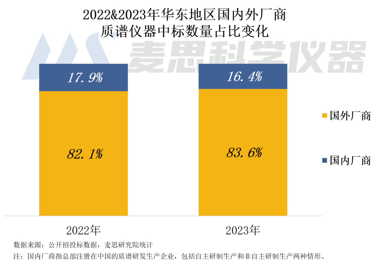 2023年華東地區(qū)國內廠商中標數(shù)量占比為16.4%,同比下降1.5個百分點。國外廠商中標數(shù)量占比為83.6%,高于全國市場平均值(76%),占據(jù)市場主導地位。從二者占比變化可見,2023年國內廠商的質譜儀器中標數(shù)量下降幅度高于國外廠商。