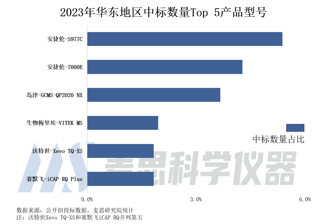 從產品型號來看,2023年華東地區(qū)質譜儀器中標數(shù)量Top 5產品分別為安捷倫-5977C、安捷倫-7000E、島津-GCMS-QP2020 NX、生物梅里埃-VITEK MS、沃特世-Xevo TQ-XS和賽默飛-iCAP RQ Plus(并列)。
