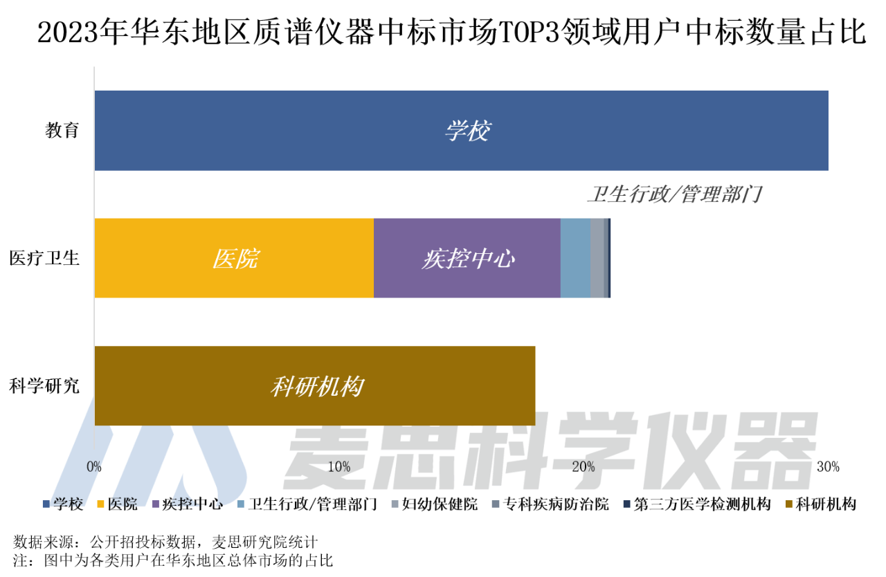 教育領域的用戶為學校,2023年中標數(shù)量占全國質譜儀器中標市場約30%,是目前華東地區(qū)質譜儀器中標市場最大采購群體。