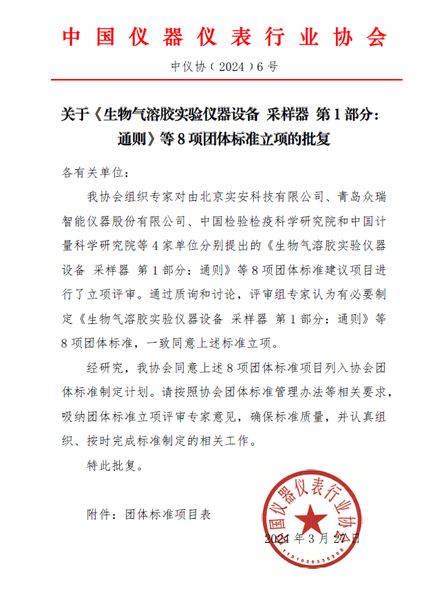 我協(xié)會組織專家對由北京實安科技有限公司、青島眾瑞智能儀器股份有限公司、中國檢驗檢疫科學研究院和中國計量科學研究院等4家單位分別提出的《生物氣溶膠實驗儀器設備 采樣器 第1部分:通則》等8項團體標準建議項目進行了立項評審。通過質(zhì)詢和討論,評審組專家認為有必要制定《生物氣溶膠實驗儀器設備 采樣器 第1部分:通則》等8項團體標準,一致同意上述標準立項。