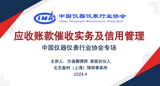 為進一步助力行業企業做好應收賬款管理,降低經營風險,提升經營效率和能力,4月26日上午,由中國儀器儀表行業協會、北京盈科(上海)律師事務所聯合舉辦的“2024年度儀器儀表行業首期培訓班--應收賬款催收實務和信用管理”圓滿舉辦。本次培訓班為線上形式,吸引了儀器儀表行業企業的近260名學員參加,中國儀器儀表行業協會副秘書長鄭朝松出席此次培訓活動并致辭。