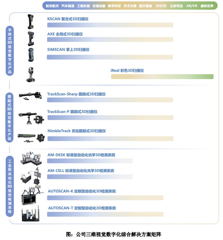 思看科技成立于2015年,公司控股股東和實際控制人均為王江峰、陳尚儉、鄭俊。公司是面向全球的三維視覺數字化綜合解決方案提供商,主營業(yè)務為三維視覺數字化產品及系統(tǒng)的研發(fā)、生產和銷售。公司深耕三維視覺數字化軟硬件專業(yè)領域多年,逐步在關鍵光學部件、核心3D視覺算法、高性能硬件結構設計、3D掃描及分析對比軟件等主要方面積累了豐富的技術能力,搭建起較為完善的三維視覺數字化技術平臺,并基于此不斷開發(fā)適應領域廣泛、通用性強的創(chuàng)新產品。目前公司產品主要覆蓋工業(yè)級和專業(yè)級兩大差異化賽道,涵蓋便攜式3D視覺數字化產品、跟蹤式3D視覺數字化產品、專業(yè)級彩色3D視覺數字化產品和工業(yè)級自動化3D視覺檢測系統(tǒng)等產品。