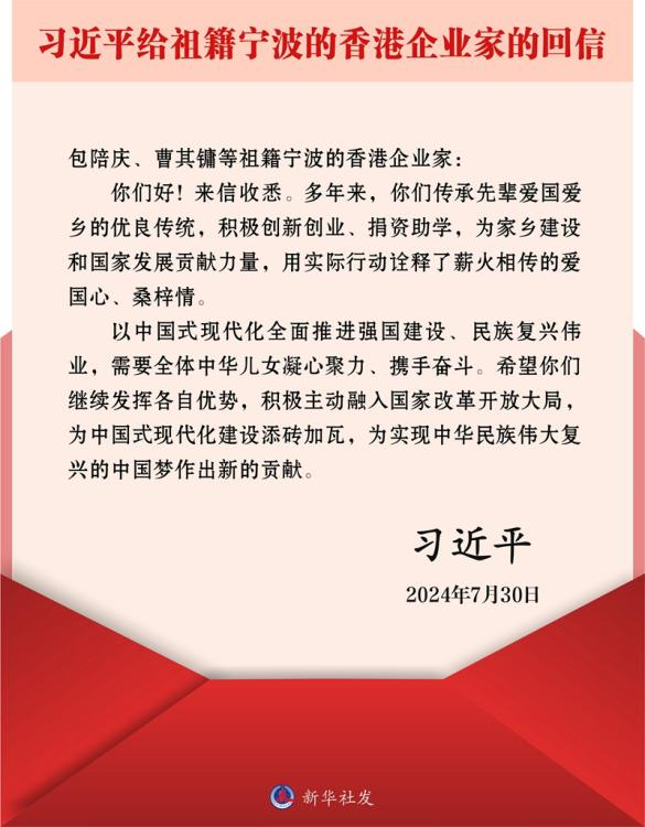 2024年7月30日,習(xí)近平總書記給祖籍寧波的香港企業(yè)家回信