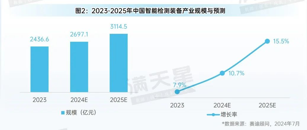 2023年中國智能檢測裝備產業規模為2436.6億元,較上年增長7.9%。受國家推進新型工業化、發展新質生產力、加快工業設備更新等利好政策影響,預計未來幾年將持續保持10%以上的增速,2025年整體產業規模將突破3000億元。隨著智能制造深入推進,智能檢測裝備需求日益增加,新技術新產品競相涌現,產業呈現快速發展勢頭。總體來看中國智能檢測裝備產業仍存在技術基礎薄弱、創新能力不強、高端供給不足、產業體系不完善和應用生態不健全等問題,已成為智能制造深入發展的關鍵短板和重要制約。黨的二十屆三中全會公報指出,高質量發展是全面建設社會主義現代化國家的首要任務。推進智能檢測裝備發展是產業基礎高級化的重要領域,對推進產業實現歷史性變革、系統性重塑、整體性重構具有重要價值。工信部等部門出臺的《智能檢測裝備產業發展行動計劃(2023-2025年)》等一系列政策,提出了“到2025年,智能檢測技術基本滿足用戶領域制造工藝需求,核心零部件、專用軟件和整機裝備供給能力顯著提升,重點領域智能檢測裝備示范帶動和規模應用成效明顯,產業生態初步形成“等發展目標。