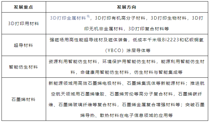 前沿新材料領(lǐng)域發(fā)展重點(diǎn)及發(fā)展方向主要包括3D打印用材料、超導(dǎo)材料、智能仿生材料、石墨烯材料等(見(jiàn)表7)。