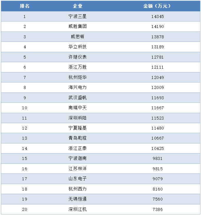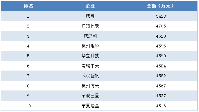 集中器及采集器中標(biāo)金額前十企業(yè)