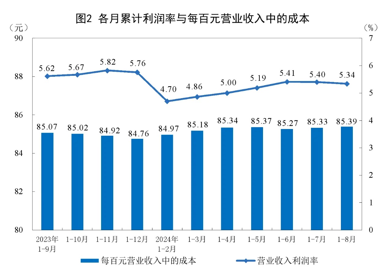1—8月份,規(guī)模以上工業(yè)企業(yè)實(shí)現(xiàn)營(yíng)業(yè)收入87.10萬(wàn)億元,同比增長(zhǎng)2.4%;發(fā)生營(yíng)業(yè)成本74.38萬(wàn)億元,增長(zhǎng)2.6%;營(yíng)業(yè)收入利潤(rùn)率為5.34%,同比下降0.10個(gè)百分點(diǎn)。