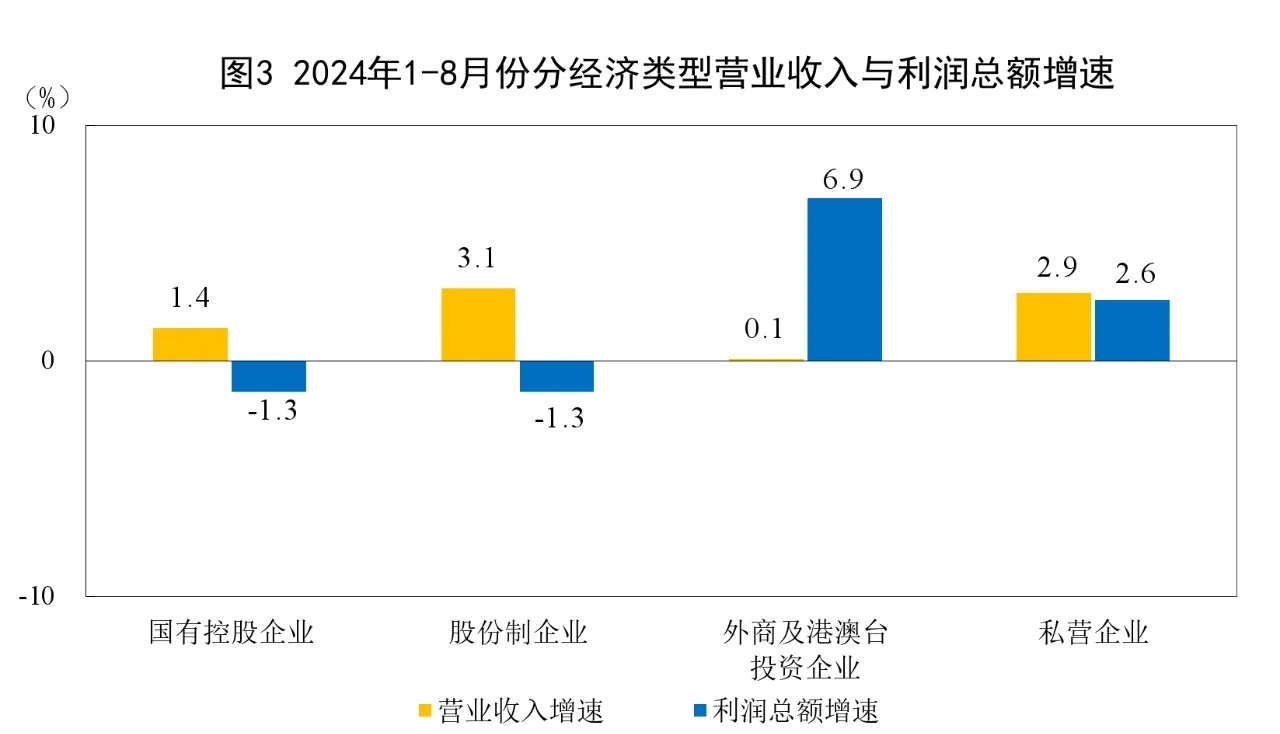 1—8月份,規(guī)模以上工業(yè)企業(yè)中,國(guó)有控股企業(yè)實(shí)現(xiàn)利潤(rùn)總額15490.6億元,同比下降1.3%;股份制企業(yè)實(shí)現(xiàn)利潤(rùn)總額34430.3億元,下降1.3%;外商及港澳臺(tái)投資企業(yè)實(shí)現(xiàn)利潤(rùn)總額11777.0億元,增長(zhǎng)6.9%;私營(yíng)企業(yè)實(shí)現(xiàn)利潤(rùn)總額12648.3億元,增長(zhǎng)2.6%。