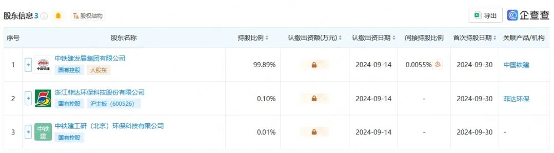 股權穿透顯示,該公司由中國鐵建全資子公司中鐵建發展集團有限公司、菲達環保、中鐵建工研(北京)環保科技有限公司共同持股。