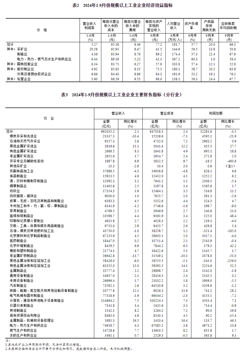 1—9月份,規(guī)模以上工業(yè)企業(yè)實(shí)現(xiàn)營業(yè)收入99.20萬億元,同比增長2.1%;發(fā)生營業(yè)成本84.70萬億元,增長2.4%;營業(yè)收入利潤率為5.27%,同比下降0.31個(gè)百分點(diǎn)。