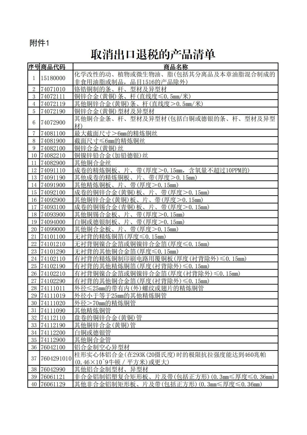 一、取消鋁材、銅材以及化學(xué)改性的動(dòng)、植物或微生物油、脂等產(chǎn)品出口退稅。