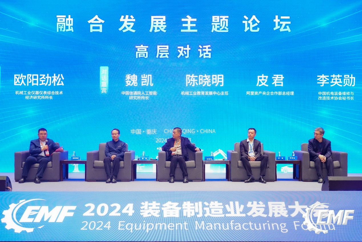 高層對話環(huán)節(jié)將論壇推向了高潮。中國信通院人工智能研究所所長魏凱、機械工業(yè)教育發(fā)展中心主任陳曉明、阿里資產(chǎn)央企合作部總經(jīng)理皮君以及中國機電裝備維修與改造技術(shù)協(xié)會秘書長李英勛等行業(yè)領(lǐng)袖圍繞推動裝備制造業(yè)與新技術(shù)融合發(fā)展、深化產(chǎn)教融合與校企合作、數(shù)字化平臺助力供應鏈安全高效發(fā)展以及推動裝備后市場產(chǎn)業(yè)發(fā)展等議題展開了深入交流和熱烈討論,為裝備制造業(yè)的未來發(fā)展提供了寶貴的思路和建議。