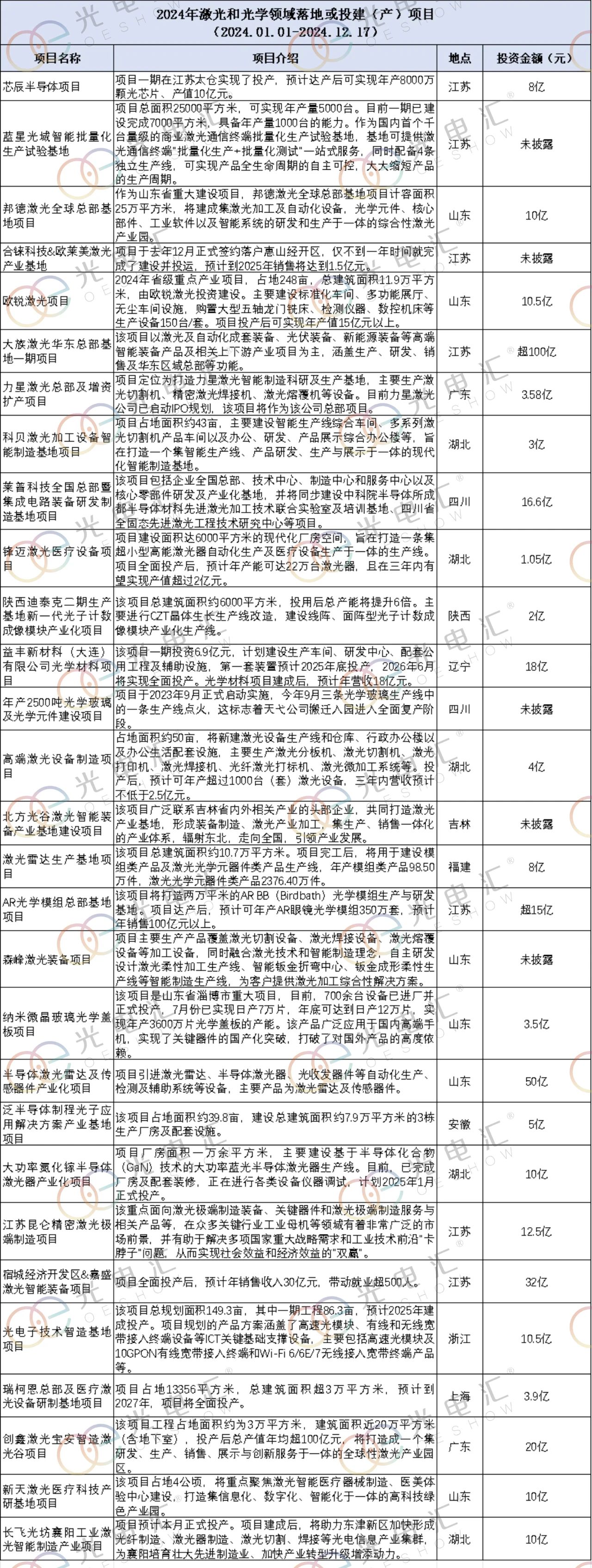 據(jù)光電匯不完全統(tǒng)計,2024年,共有29個激光和光學(xué)相關(guān)的項目落地、投建或啟用,其中,24個項目公布了投資金額,總投資超367億。