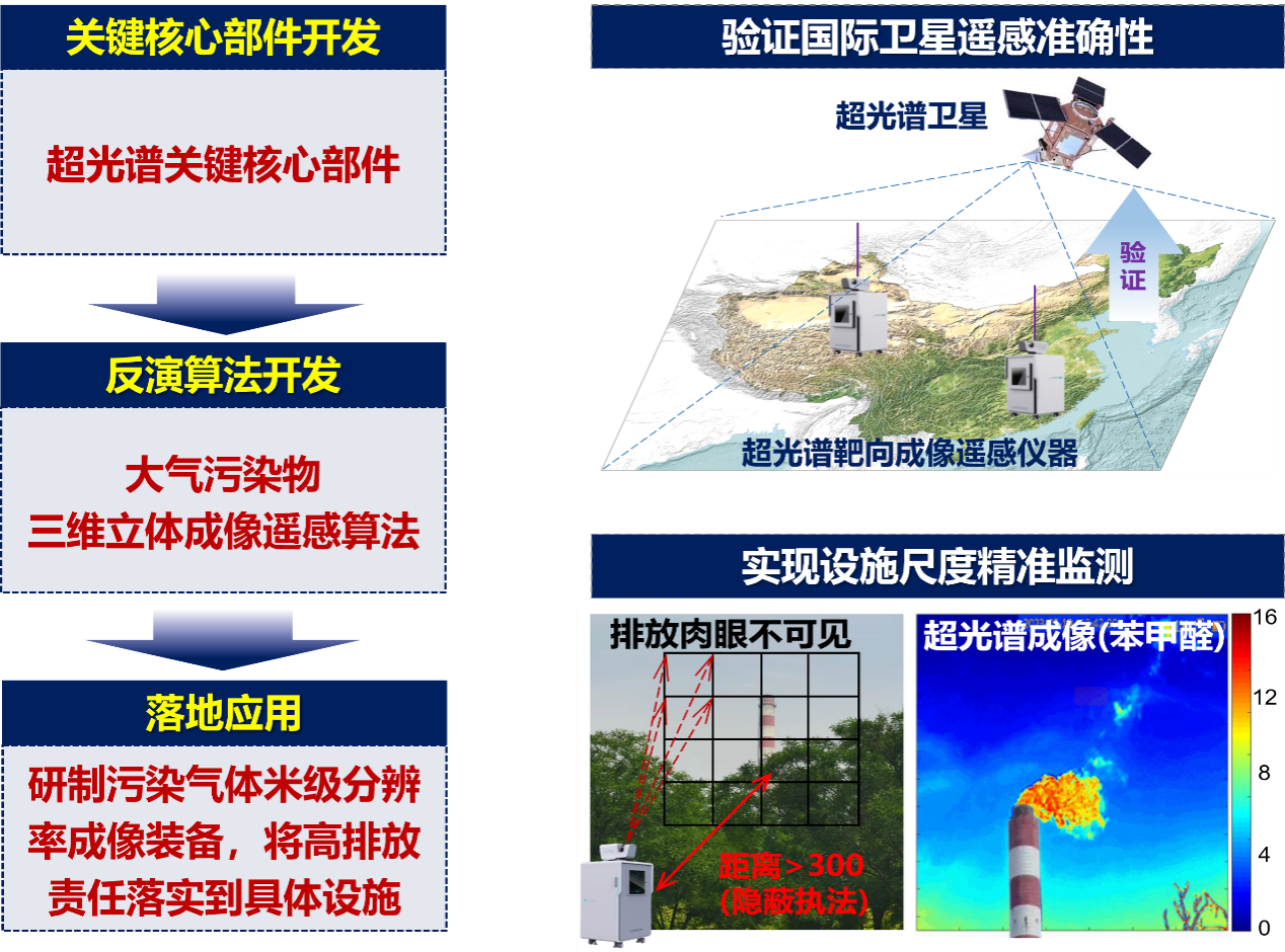 為此,團隊在國家重點研發計劃、國家自然科學基金重大研究計劃等項目支持下,研制了一款超光譜分辨率、高信噪比、狹縫函數穩定的超分辨光譜儀,打破了大氣環境遙感領域對歐美關鍵核心部件的長期高度依賴;研制了高光程體積比的多通道光學極弱吸收性氣體吸收截面檢測裝置,實現了對醛類、酮類、酯類和苯系物等吸收信號極弱的多種VOCs特征“指紋”吸收信號的精確探測;研發了超光譜解析融合人工智能的靶向成像遙感算法,解決了羽流內極復雜光子路徑精準刻畫的難題,實現了排放羽流米級分辨率成像觀測,將污染排放責任從公里級網格細化到具體施級尺度。
