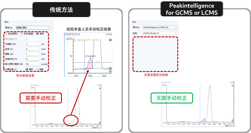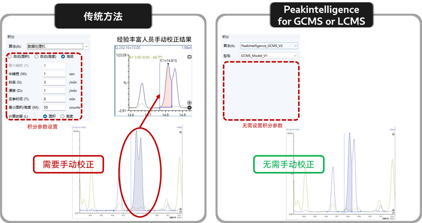 Peakintelligence亮點在于它只需選擇要使用的算法和模型,無需再設(shè)置任何積分參數(shù),即使是色譜峰基線分配困難、重疊峰、痕量小峰等復(fù)雜情況,亦可實現(xiàn)高水平的自動積分結(jié)果,大大簡化積分參數(shù)優(yōu)化及手動校正工作。