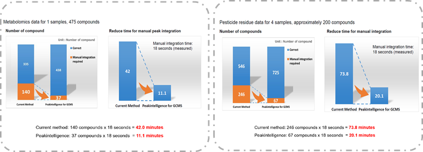 為進一步驗證積分結(jié)果的準確性,分別選取1個含有475種代謝物樣品和4個含有約200種農(nóng)藥殘留組分樣品的數(shù)據(jù)進行傳統(tǒng)方法和智能積分方法的分析比對,結(jié)果確證Peakintelligence可以重現(xiàn)90%以上專家積分結(jié)果。與此同時,經(jīng)驗豐富的操作員分別對兩組積分結(jié)果進行目視審查和手動積分修正,統(tǒng)計并比較數(shù)據(jù)處理的操作用時,結(jié)果顯示代謝物和農(nóng)殘兩類樣品定量分析時間均縮短至傳統(tǒng)方法的1/4,數(shù)據(jù)處理效率顯著提升。