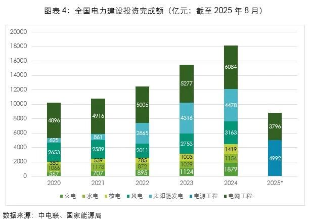 “十四五”我國電力建設(shè)投資保持快速增長,2020年突破1萬億元,2024年超1.8萬億元,2025年1-8月電源及電網(wǎng)投資同比均進(jìn)一步增長。其中,火電投資增長速度同樣迅猛,從2020年的567億元,到2023年的1124億元已接近翻倍,再到2024年的1879億元又有67%的大幅增長。