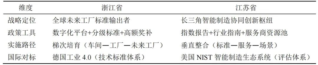 在實(shí)施路徑維度:浙江省推行梯次培育路徑,從智能車間到未來工廠分階段進(jìn)階;江蘇省實(shí)施垂直整合,以標(biāo)準(zhǔn)引領(lǐng)、服務(wù)支撐、場(chǎng)景落地的方式構(gòu)建產(chǎn)業(yè)生態(tài)。