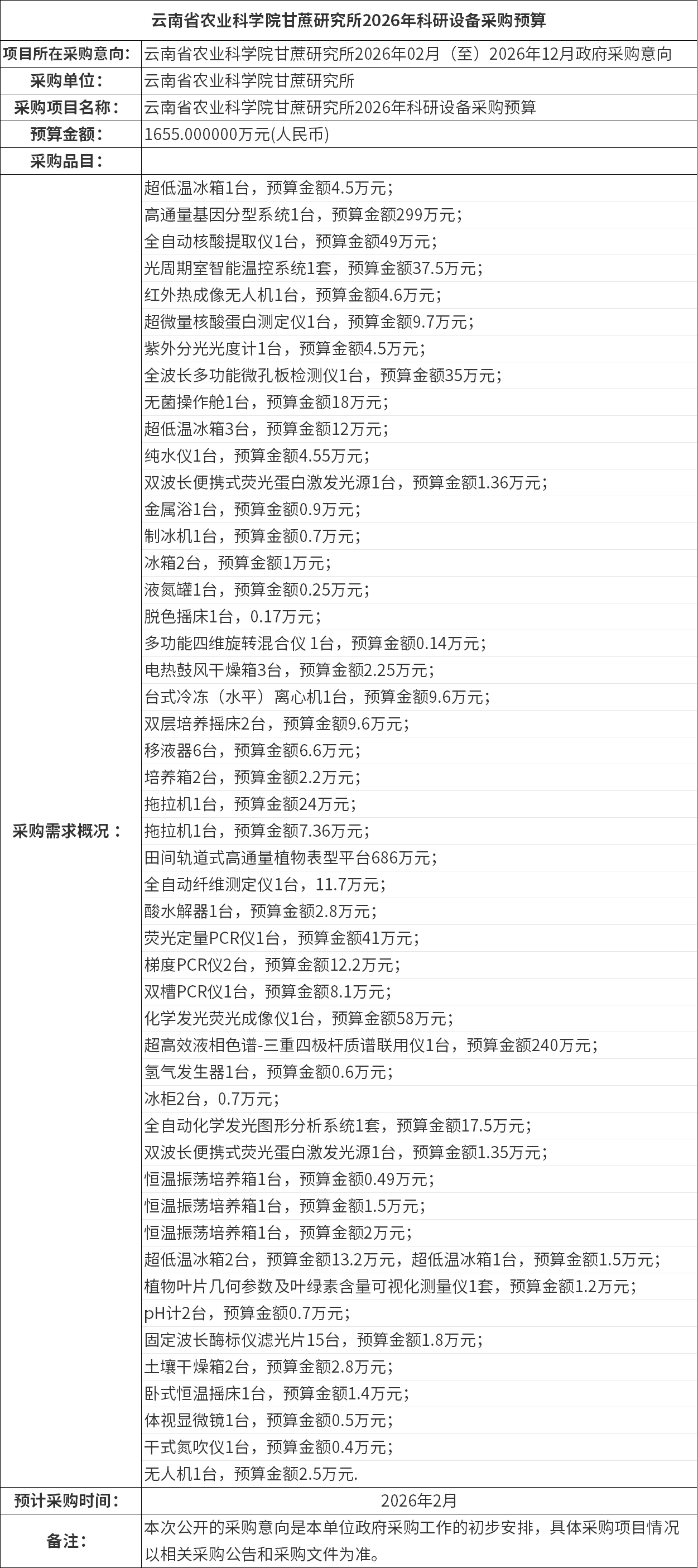 云南省農(nóng)業(yè)科學(xué)院甘蔗研究所2026年年科研設(shè)備采購預(yù)算情況發(fā)布,采購51臺套儀器設(shè)備,預(yù)算金額1655萬元。