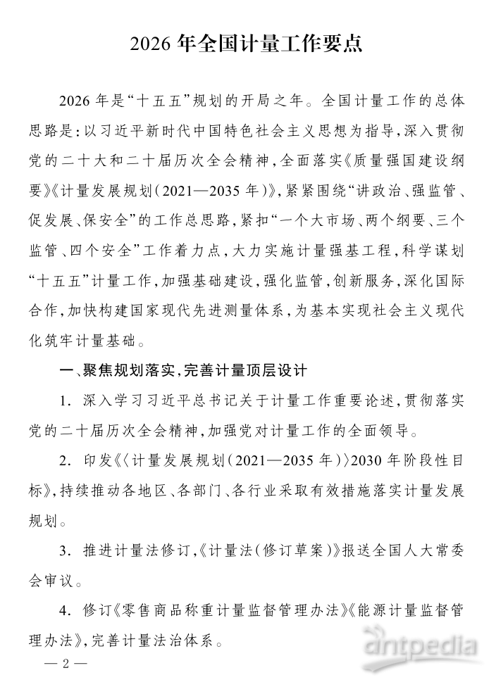 近日,市場監(jiān)管總局印發(fā)《2026年全國計量工作要點》,明確2026年將緊緊圍繞“講政治、強監(jiān)管、促發(fā)展、保安全”的工作總思路,緊扣“一個大市場、兩個綱要、三個監(jiān)管、四個安全”工作著力點,大力實施計量強基工程,科學謀劃“十五五”計量工作,加強基礎(chǔ)建設(shè),強化監(jiān)管,創(chuàng)新服務,深化國際合作,加快構(gòu)建國家現(xiàn)代先進測量體系,為基本實現(xiàn)社會主義現(xiàn)代化筑牢計量基礎(chǔ)。