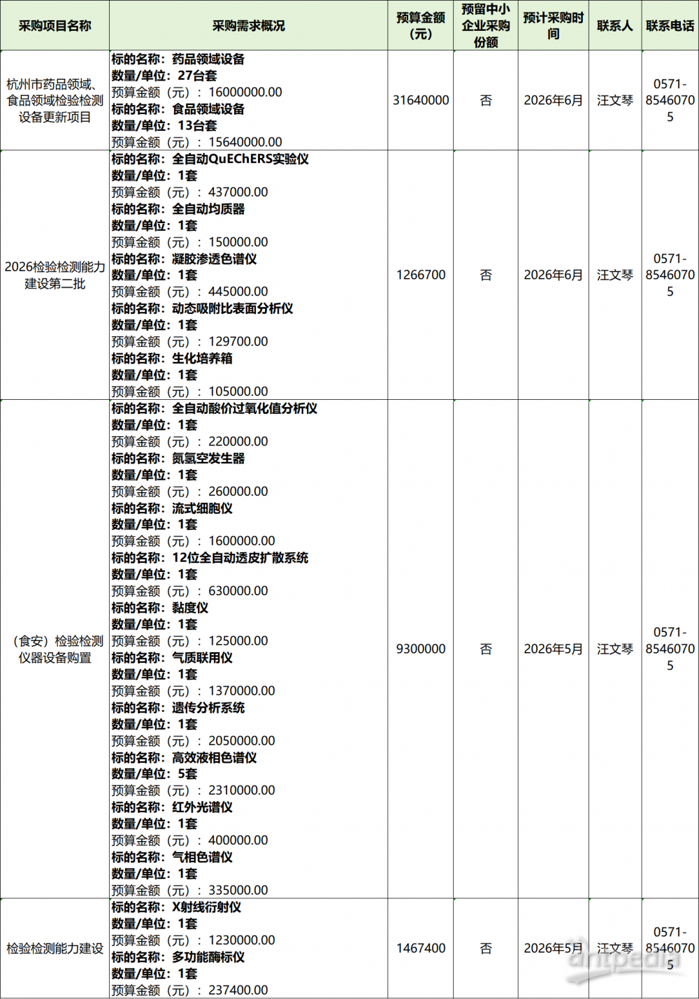 為便于供應商及時了解政府采購信息,根據(jù)《財政部關于開展政府采購意向公開工作的通知》(財庫〔2020〕10號)等有關規(guī)定,現(xiàn)將杭州市食品藥品檢驗科學研究院2026年5月至6月采購意向公開如下: