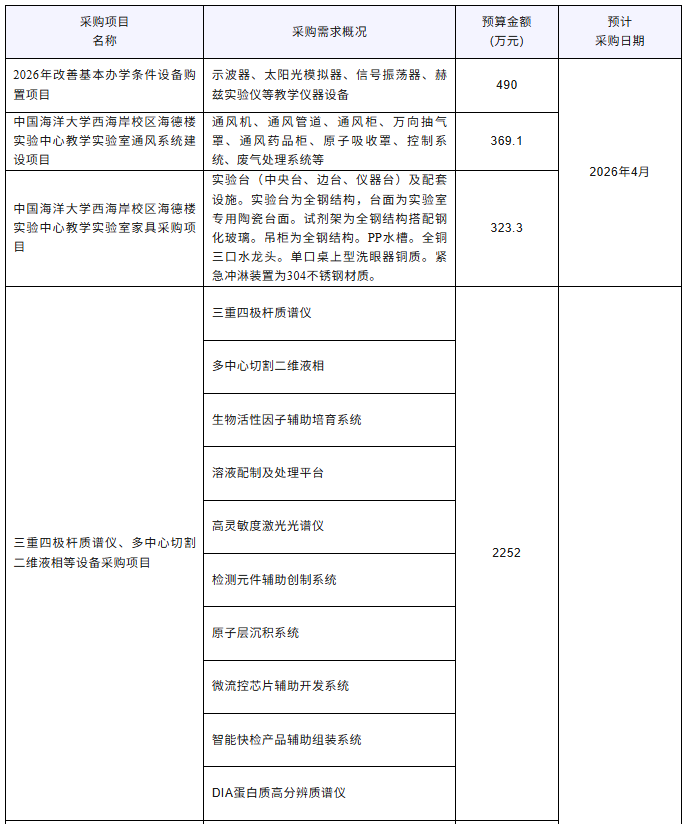 近期,中國海洋大學(xué)發(fā)布多項儀器采購意向,計劃采購三重四極桿質(zhì)譜儀、高靈敏度激光光譜儀、原子層沉積系統(tǒng)、DIA蛋白質(zhì)高分辨質(zhì)譜儀、真空帶式連續(xù)干燥機(jī)、石英晶體微天平、X射線衍射儀、研究級偏光顯微鏡等儀器設(shè)備,預(yù)算總金額11275萬元。預(yù)計采購時間2026年4月~6月。
