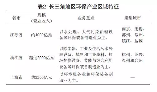 長(zhǎng)三角地區(qū)是我國(guó)環(huán)保產(chǎn)業(yè)發(fā)展最好的地區(qū),長(zhǎng)三角地區(qū)環(huán)保產(chǎn)業(yè)總產(chǎn)值約占全國(guó)環(huán)保產(chǎn)業(yè)總產(chǎn)值30%。其中江蘇省和浙江省環(huán)保產(chǎn)業(yè)規(guī)模分別占全國(guó)的第一和第二。資源循環(huán)利用產(chǎn)品銷售收入浙江省、江蘇省和上海市列全國(guó)第一和第二、第二十。環(huán)境保護(hù)產(chǎn)品銷售收入江蘇省、浙江省和上海市分別列全國(guó)第一、第二和第八。環(huán)境保護(hù)服務(wù)營(yíng)業(yè)收入江蘇省、浙江省和上海市分別列居第二、第四和第九。環(huán)境友好產(chǎn)品銷售收入上海、江蘇和浙江省分別列居第一、第四和第十二。由此可看出,江蘇省和浙江省環(huán)保產(chǎn)業(yè)發(fā)展較為均衡,無論從資源循環(huán)利用、環(huán)保裝備制造,還是環(huán)境保護(hù)服務(wù),均具有較強(qiáng)的優(yōu)勢(shì);上海市主要是以環(huán)境服務(wù)業(yè)和環(huán)境友好產(chǎn)品生產(chǎn)為主。長(zhǎng)三角地區(qū)環(huán)保產(chǎn)業(yè)區(qū)域特征見表2。