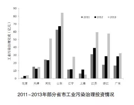 從2011~2013年北京、天津、山東和河北省等地區(qū)對(duì)工業(yè)環(huán)境污染治理投資的變化來看,各地區(qū)均呈現(xiàn)波次遞進(jìn)性增長(zhǎng),其中河北省、山東省、江蘇省和浙江省的工業(yè)污染治理投資力度較大,環(huán)保投資的逐年增加,將對(duì)各區(qū)域的污染治理設(shè)施運(yùn)行費(fèi)用、環(huán)保產(chǎn)業(yè)、GDP增長(zhǎng)、就業(yè)等方面具有較顯著的拉動(dòng)作用,2011~2013年北京、河北、山東等地的工業(yè)污染治理投資情況詳見下圖[3]。