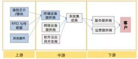 (1)上游主要包括感知層的傳感器、智能識別、定位等感知設備供應商等和網絡層的各類型芯片/模組供應商、網絡設備供應商及電信運營商等;